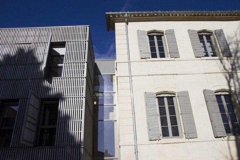 ![]() ![]() Ce projet concerne la rénovation basse consommation et l'extension de la Maison du Parc Naturel Régional des Alpilles sur la commune de Saint Rémy de Provence. Il s'articule autour d'une ancienne ancienne bâtisse bourgeoise (644 m²) du Domaine de la Cloutière construite fin XVIIIème, non protégée au titre des Monuments Historiques, mais qui présente un fort caractère patrimonial. Elle est destinée à accueillir les expositions au rez de chaussée et au premier étage, ainsi que des bureaux au deuxième étage. En parallèle, une extension (412 m²) dotée d'une architecture contemporaine, a été adossée au bâtiment existant en limite du cœur historique et périmètre des bâtiments classés de Saint Remy de Provence. Il a pour vocation à accueillir le public au rez de chaussée et d'installer des bureaux au R+1.