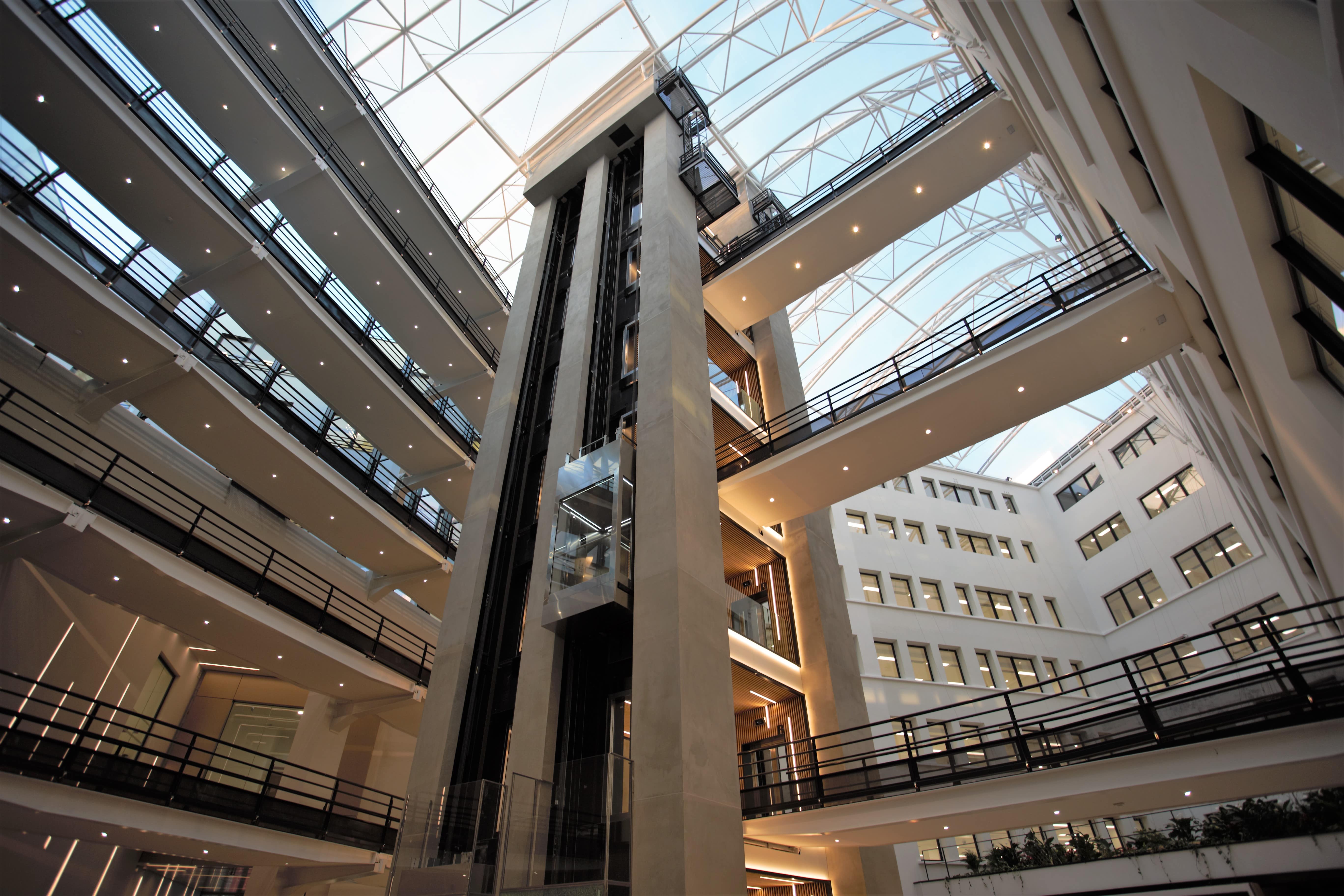 Les menuiseries existantes sont principalement en aluminium à rupteurs de ponts thermiques ou en bois avec des doubles vitrages performants. Par ailleurs, l'atrium "profite de la lumière naturelle grâce une couverture transparente à contrôle solaire" (source Calq Architecture).