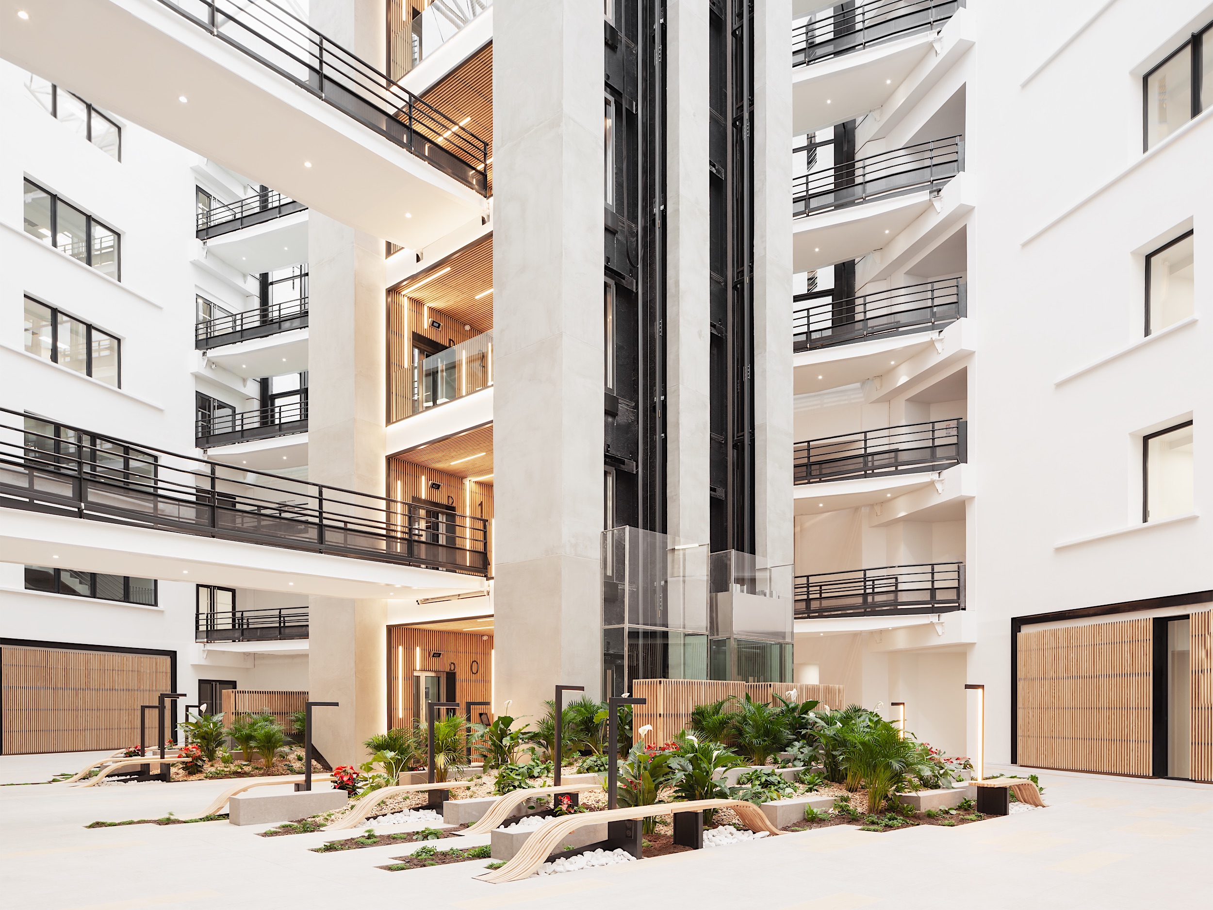 Les travaux de rénovation énergétique ont consisté à travailler sur l'enveloppe du bâtiment en proposant suivant les façades une isolation par l'intérieur ou par l'extérieur avec des finitions enduits ou en bardage béton blanc. Ce bardage et les jeux de boites vitrées en débord ont permis d'apporter une architecture plus contemporaine au bâtiment côté "avenue Gambetta". En parallèle, les toitures terrasses ont été isolées avec du polyuréthane et les dalles des planchers bas ont bénéficié d'une isolation performante.